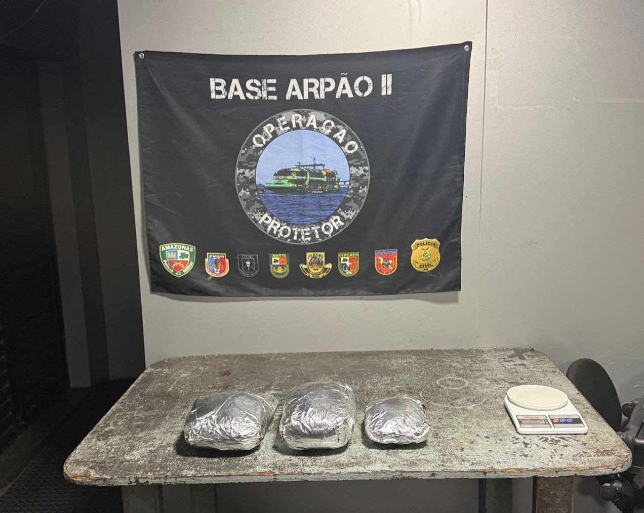 Manaus (AM) – A Polícia Militar do Amazonas (PMAM) em operação na Base Arpão 2, prendeu, no domingo (14/12), um homem, de 19 anos, por suspeita de tráfico de drogas, durante fiscalização em uma embarcação nas proximidades de Coari (a 363 quilômetros de Manaus). Na ação, foram apreendidos 5,8 quilos de entorpecentes avaliados em cerca de R$ 290 mil.