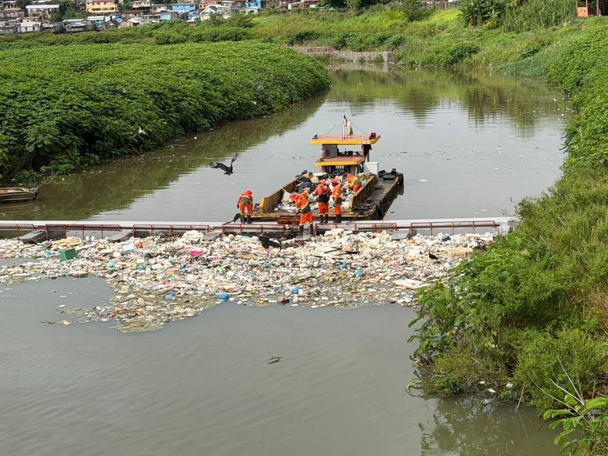 As ecobarreiras retém o lixo dos rios e igarapés que são retirados por equipes de limpeza (Guilherme Pinto /Semulsp)