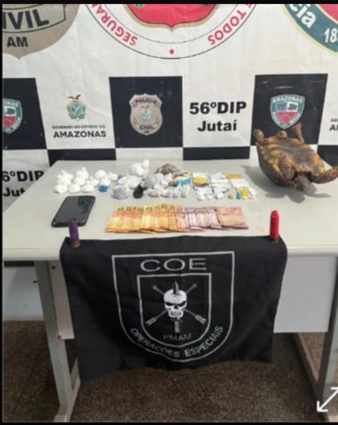 Em Jutaí (a 750 quilômetros de Manaus) durante patrulhamento no bairro Plínio Coelho, a Polícia Militar prendeu um homem de 31 anos, suspeito de envolvimento com tráfico de drogas. Após denúncias, a equipe realizou buscas em uma residência, onde encontrou entorpecentes, munições, dinheiro em espécie, além de um jabuti, caracterizando também crime ambiental.