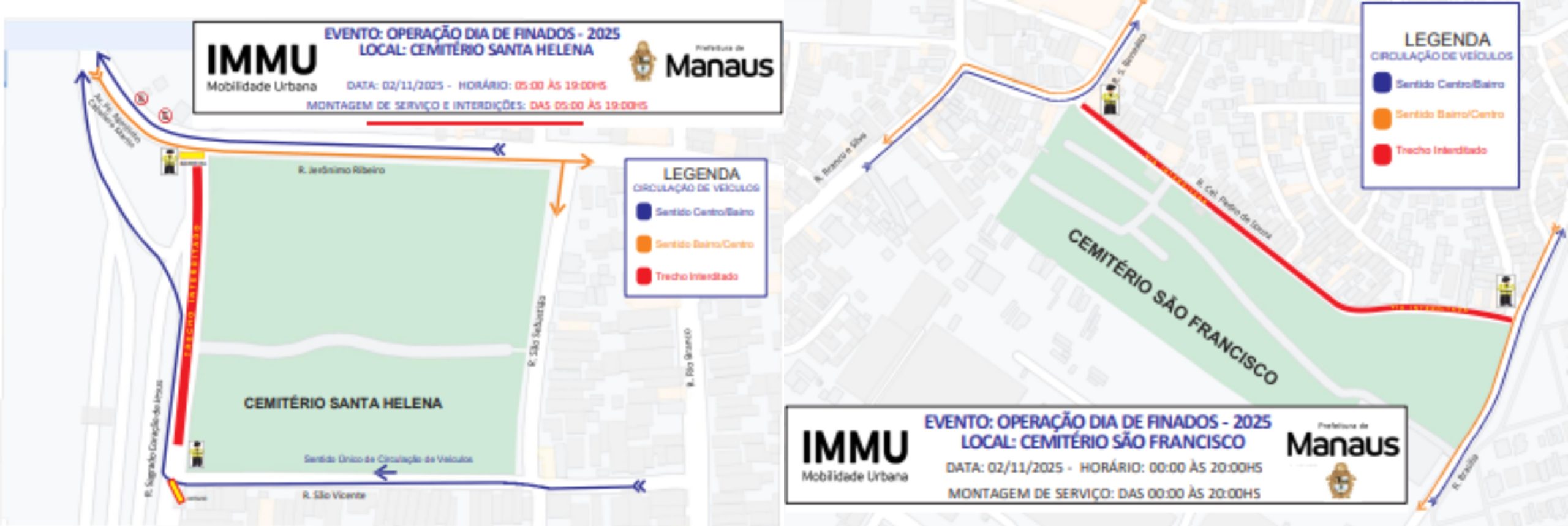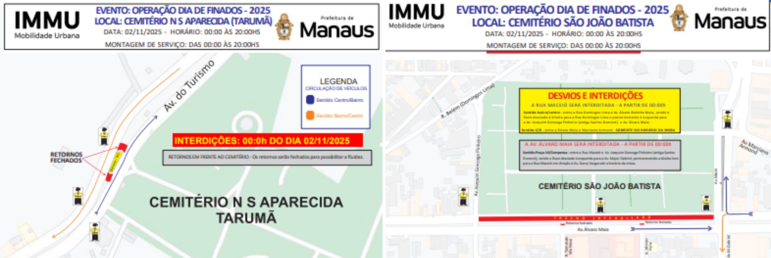 O IMMU atuará com 203 agentes de trânsito e fiscais de transporte no gerenciamento e organização do trânsito nas imediações dos cemitérios. Motoristas devem estar atentos às interdições e desvios, que iniciam à 0h de domingo (2/11).