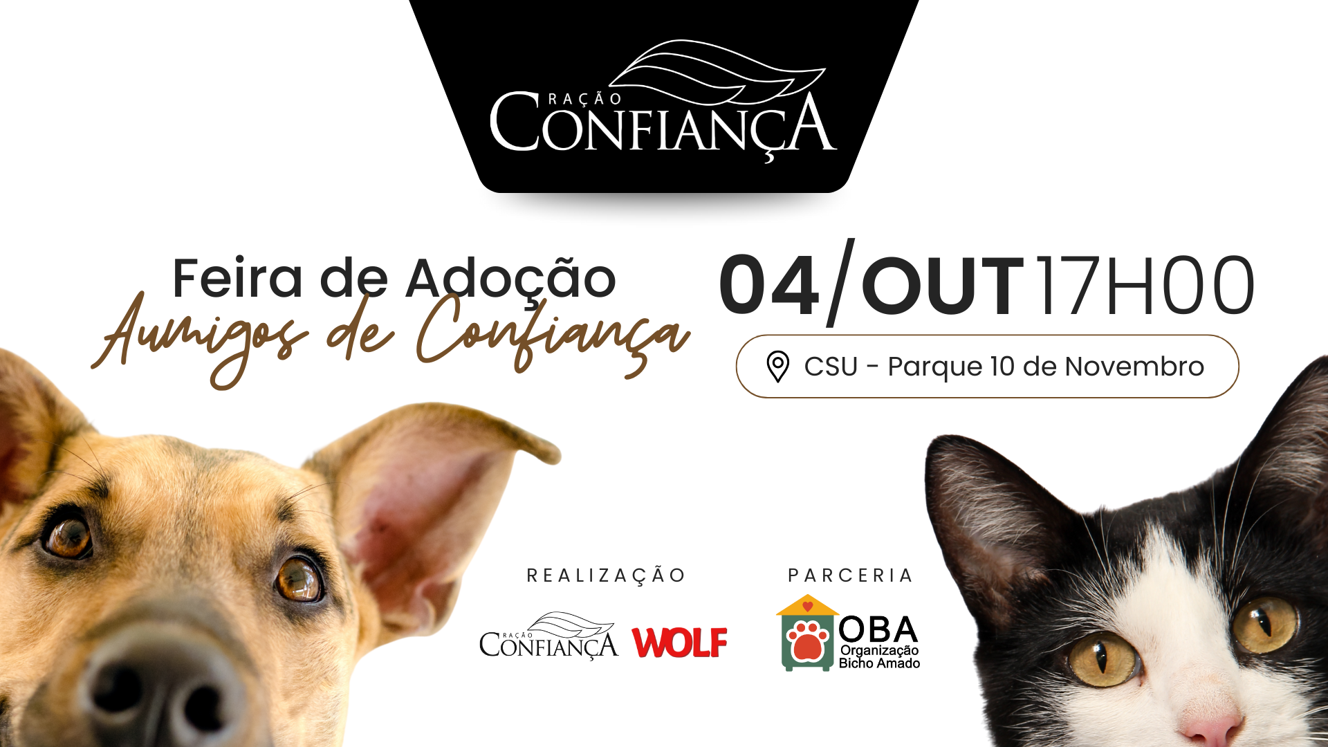 Manaus (AM) – A Ração Confiança realiza, no próximo dia 4 de outubro, mais uma edição da Feira de Adoção Pet. O evento, celebrado no Dia Nacional da Adoção, acontecerá das 17h, no Centro Social Urbano (CSU) do Parque Dez, na zona Centro-Sul da cidade.