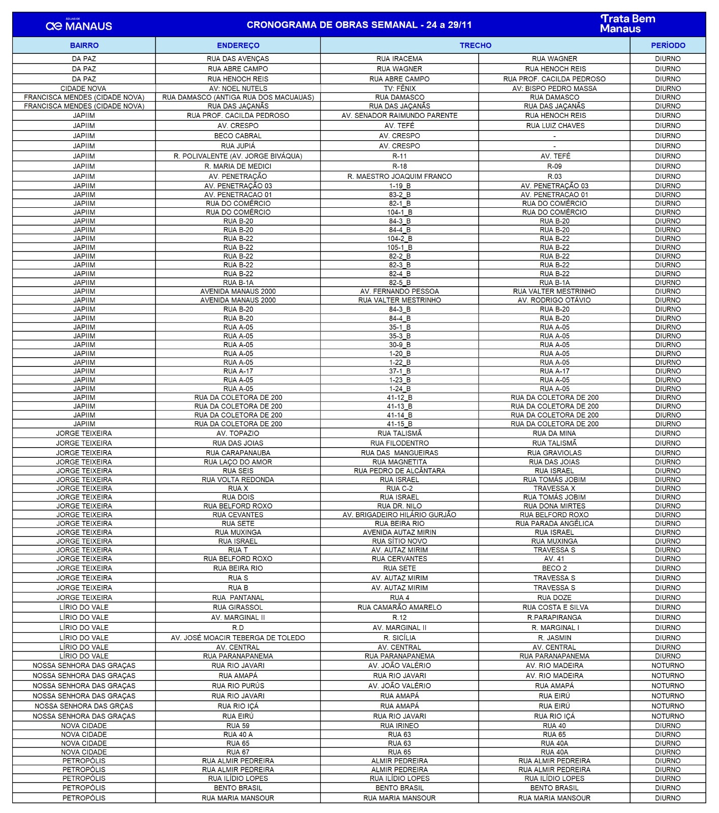As atividades são realizadas nos turnos diurno e noturno, conforme o fluxo de veículos de cada via. A concessionária destaca que, durante a execução dos serviços, as ruas são devidamente interditadas e sinalizadas para garantir a segurança dos moradores e motoristas.