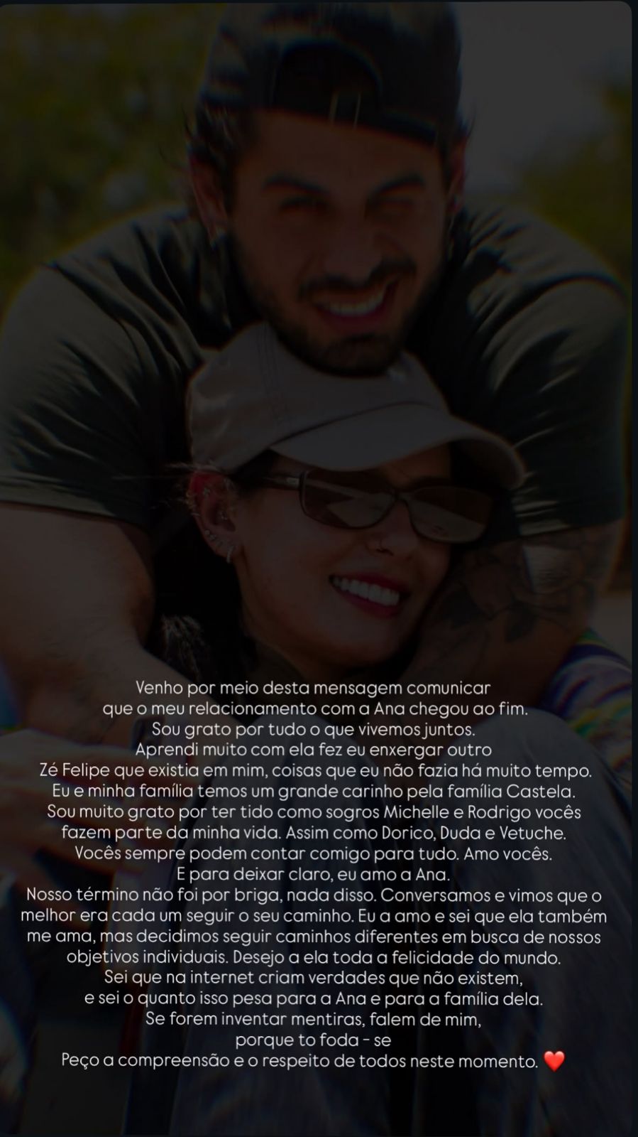 A confirmação do término veio por meio de um texto publicado pelo cantor nos stories, que posteriormente foi compartilhado por Ana em seu perfil. Zé Felipe, de 27 anos, e Ana Castela, de 22, haviam tornado o relacionamento público no início de outubro de 2025.